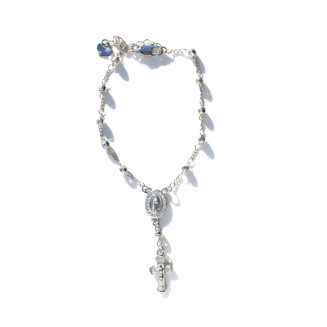 A delicate silver rosary-inspired bracelet featuring a detailed Virgin Mary medal and cross charm. Elegant, meaningful, and perfect for everyday faith-filled wear.