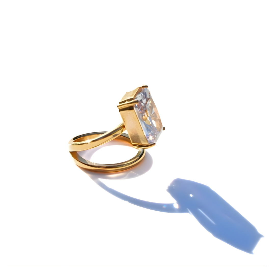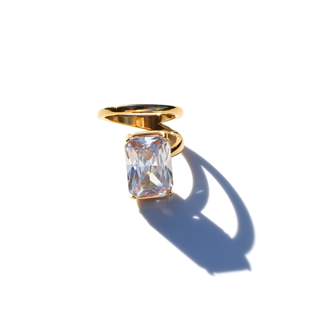 A bold gold ring featuring a breathtaking emerald-cut stone that catches the light with every move. Modern, elegant, and unmistakably glamorous — the perfect statement piece for elevating any look.