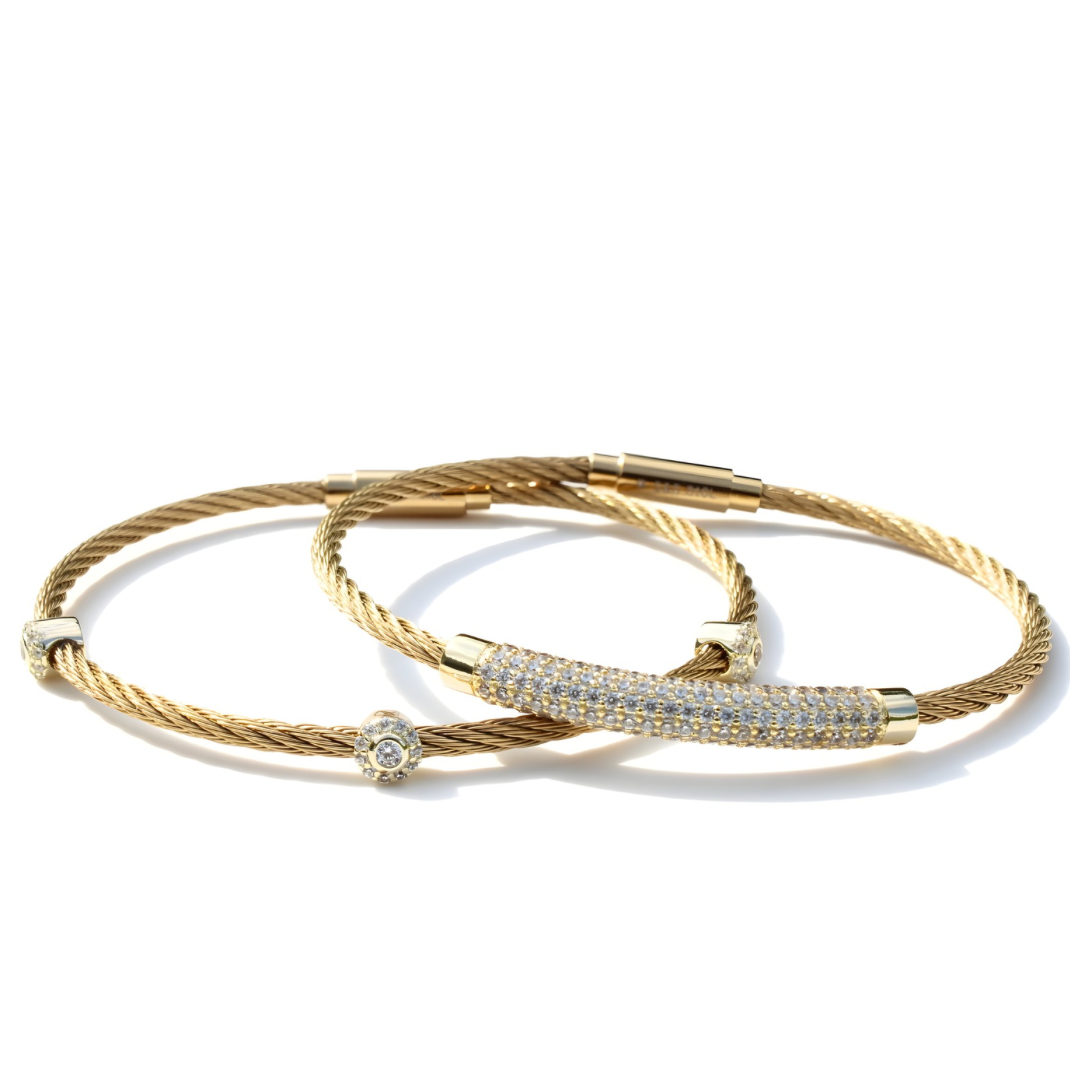 Set of 2 elegant gold wire bracelets with magnetic clasp and sparkling white pave details. Wear solo or stack multiple pieces to create your signature look. Versatile and stunning.