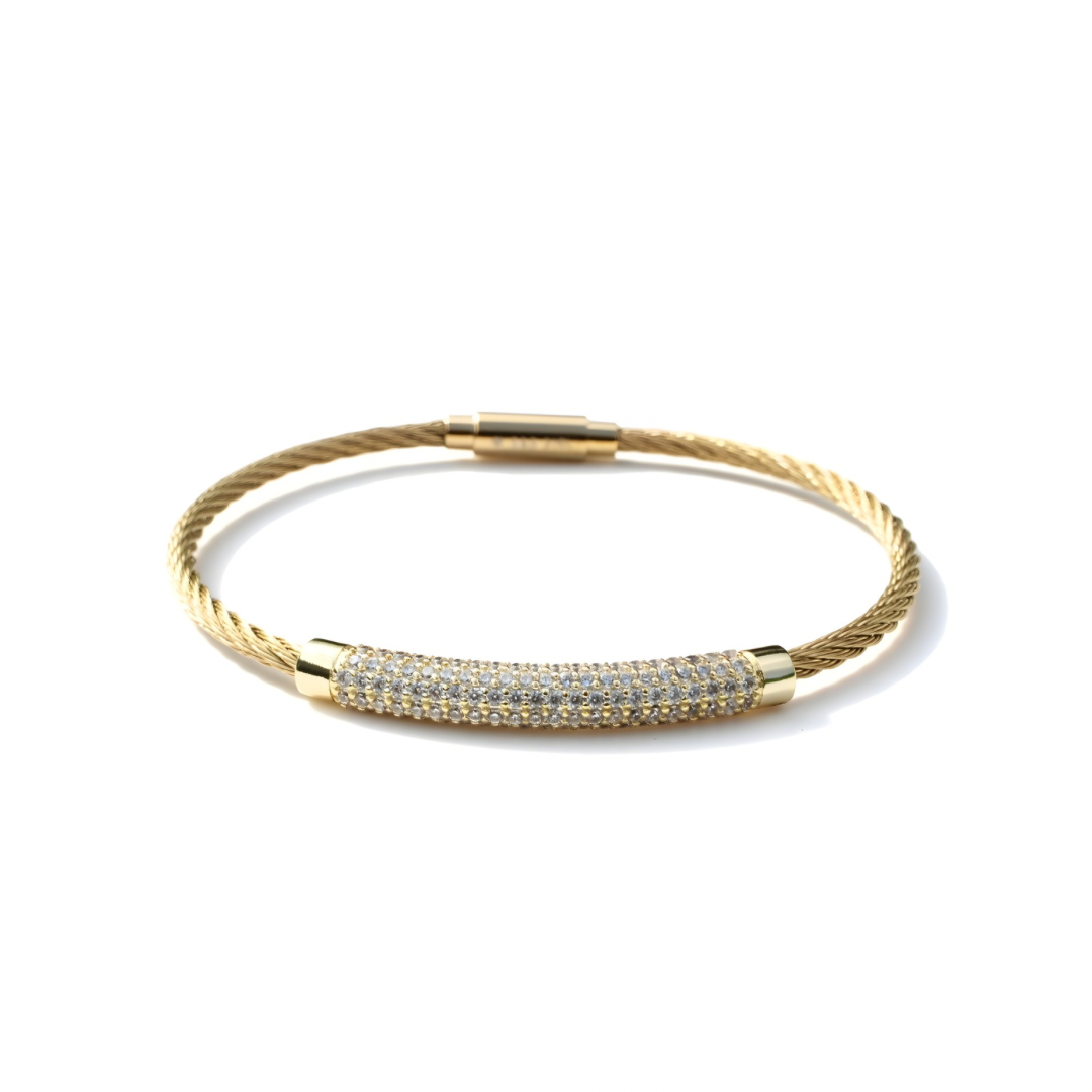 Elegant gold wire bracelet with magnetic clasp and sparkling white pave details. Wear solo or stack multiple pieces to create your signature look. Versatile and stunning.