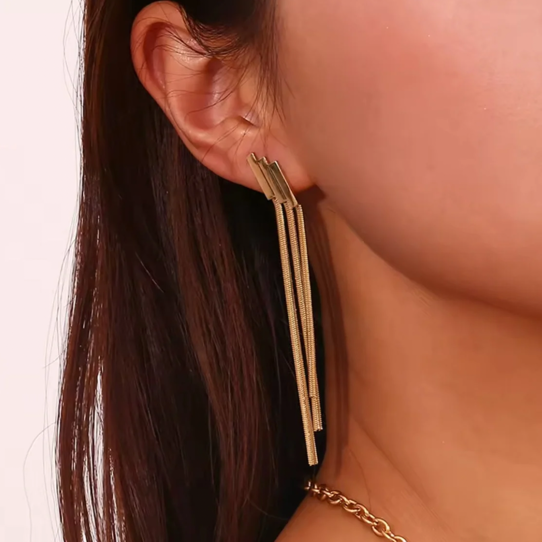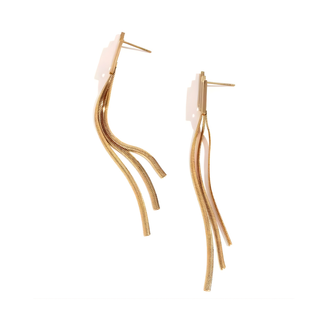 Sleek gold drop earrings with fluid, multi-strand movement that catches the light beautifully. Modern, elegant, and effortlessly dramatic — perfect for elevating any look.