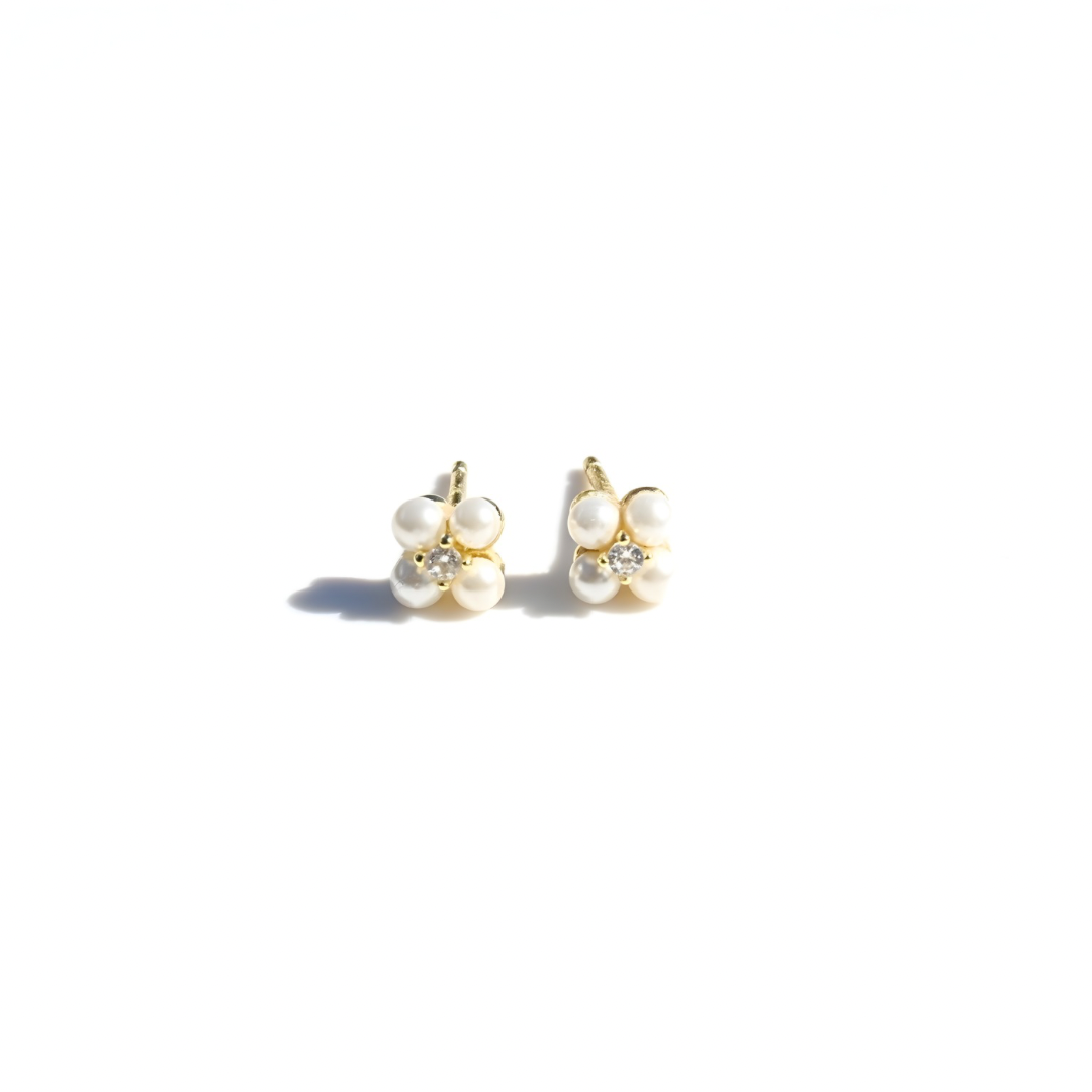 Gold-tone stud earrings with pearl cluster detailing and a clear center stone.