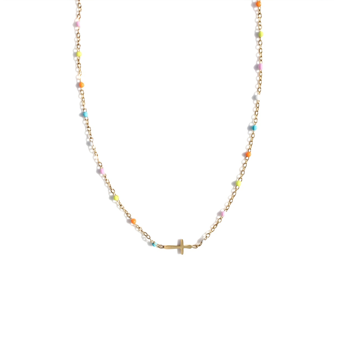 This necklace is made with pastel enamel and gold, creating a truly spectacular piece that features a sideways cross pendant.
