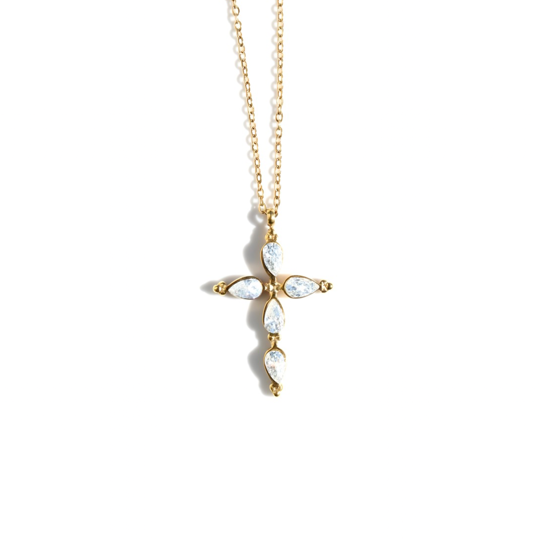A gold-tone necklace featuring a crystal cross pendant with pear-shaped stones for a classic and elegant look.