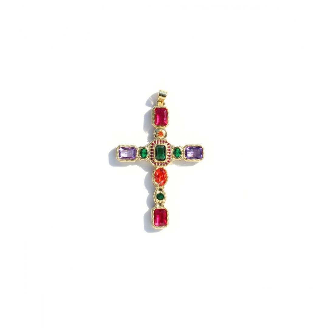 Inspired by vintage elegance, this statement cross pendant features vibrant gemstone accents framed in gold-tone detailing. A timeless piece with bold character. Pendant only, no chain.