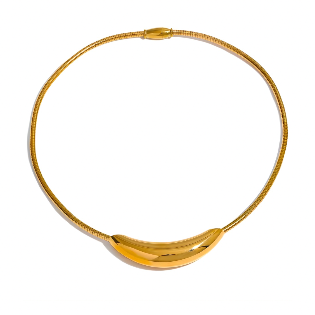 A sleek, sculptural gold spring collar that makes an effortless statement. With its smooth curved centerpiece and modern, polished finish, this piece adds bold sophistication to any look and a bonus convenient magnetic clasp.
