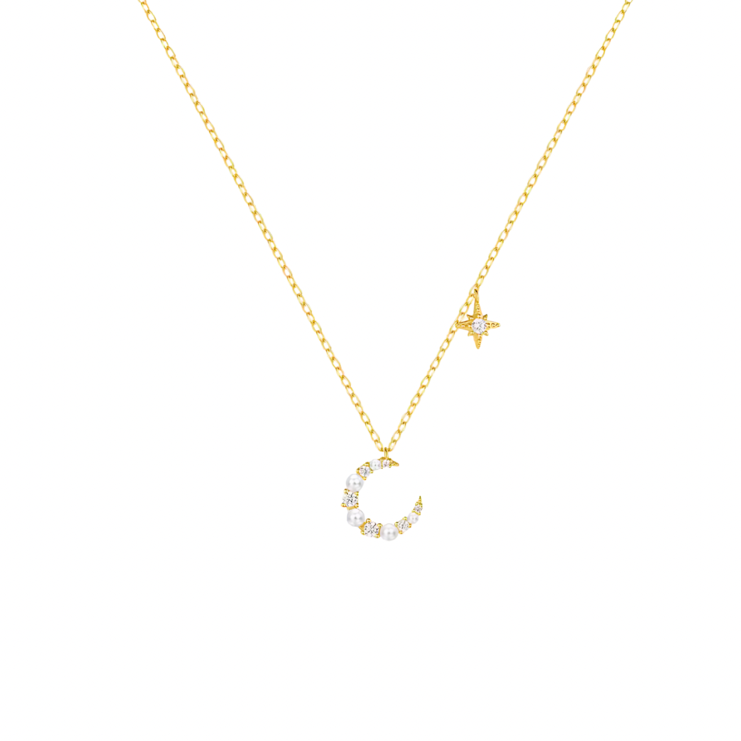 This delicate moon and star necklace features a sparkling moon adorned with rhinestones and pearls, complemented by a single star set beside the chain for an elegant touch.