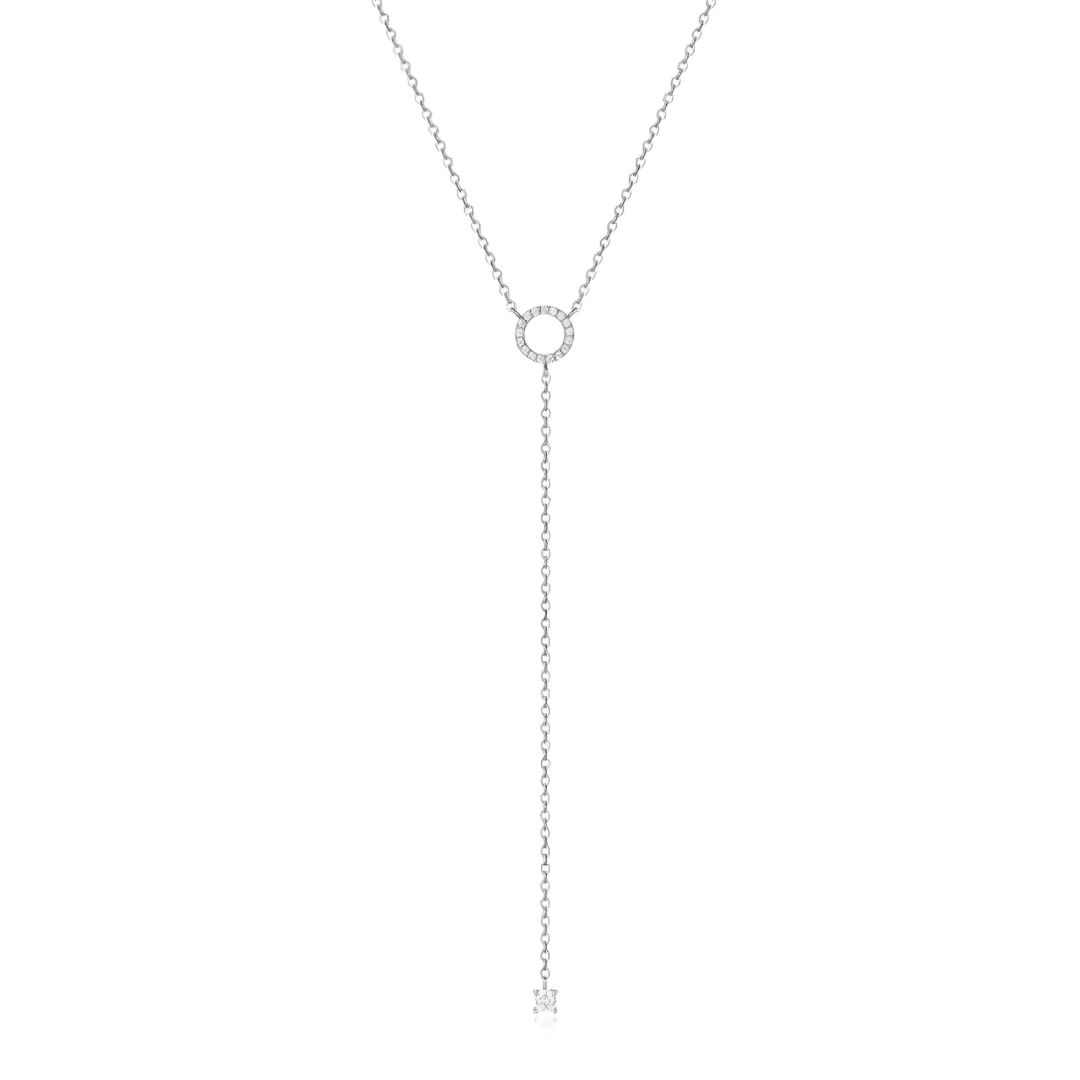 This lariat necklace features a rhinestone-encrusted circle positioned midway and finishes with an elegant, delicate square rhinestone, adding a touch of sparkle to any outfit.